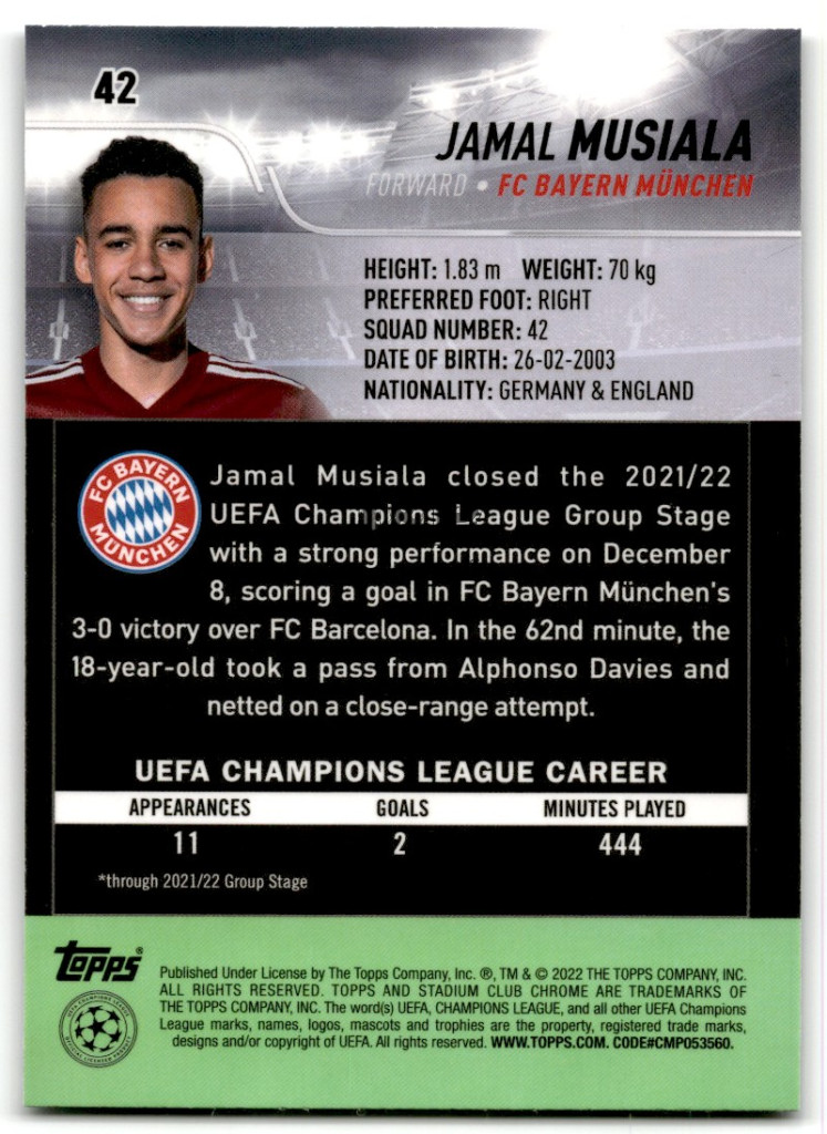 2021-22 Stadium Club Chrome UEFA Champions League #42 Jamal Musiala