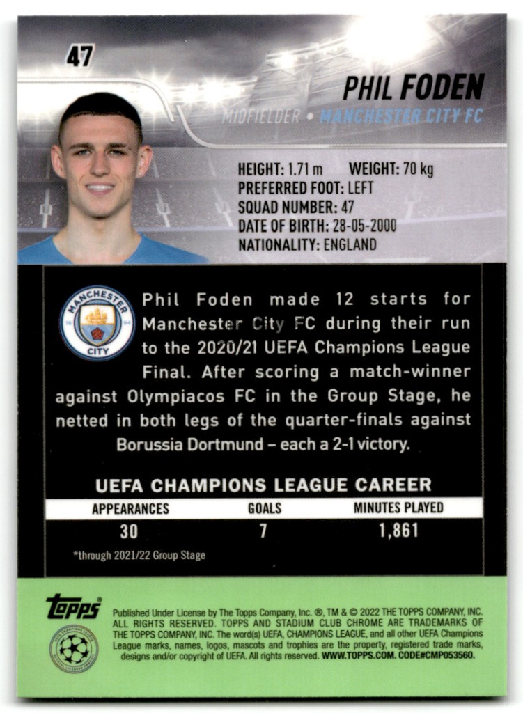 2021-22 Stadium Club Chrome UEFA Champions League #47 Phil Foden