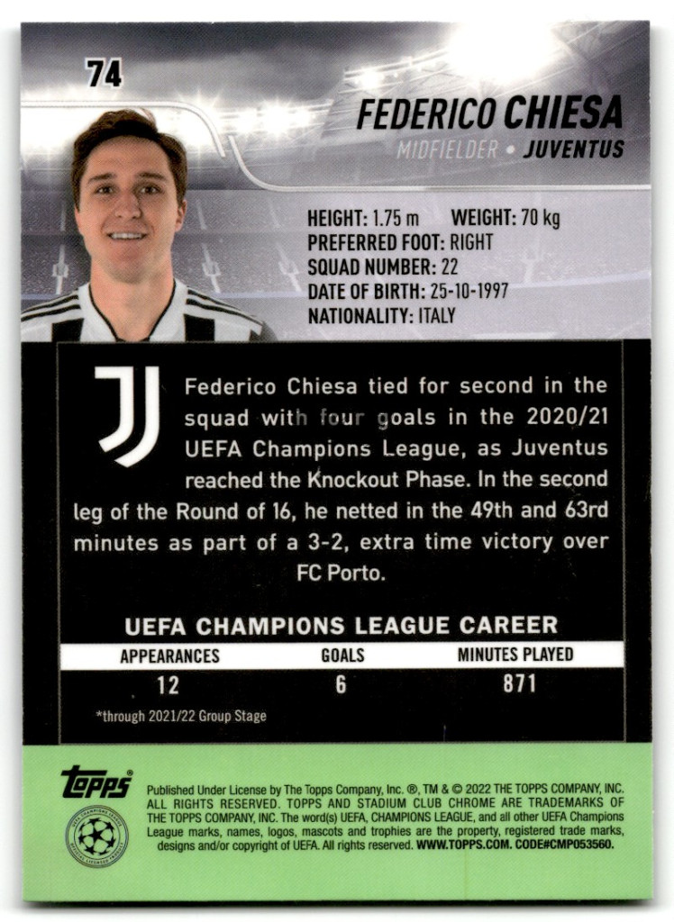 2021-22 Stadium Club Chrome UEFA Champions League #74 Federico Chiesa