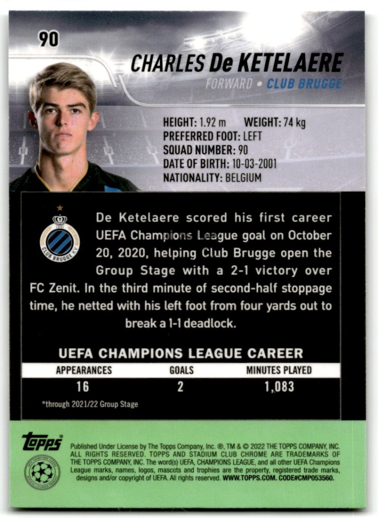 2021-22 Stadium Club Chrome UEFA Champions League #90 Charles De Ketelaere