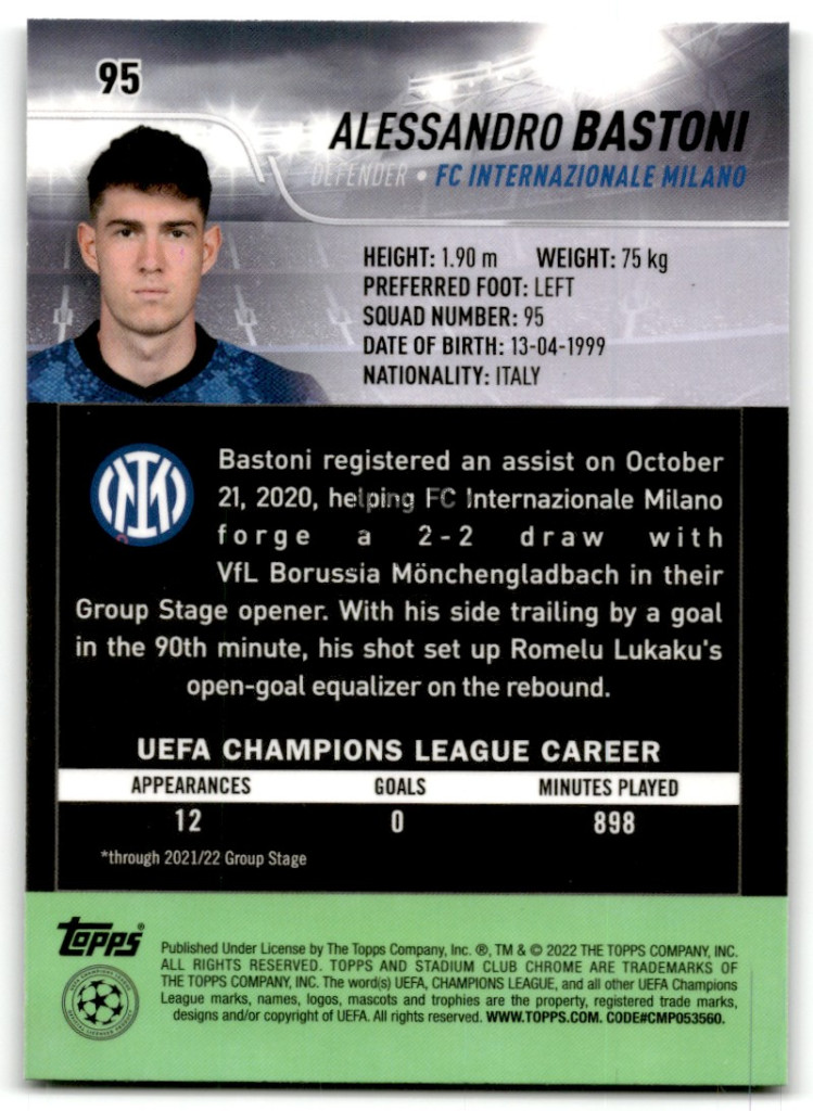 2021-22 Stadium Club Chrome UEFA Champions League #95 Alessandro Bastoni