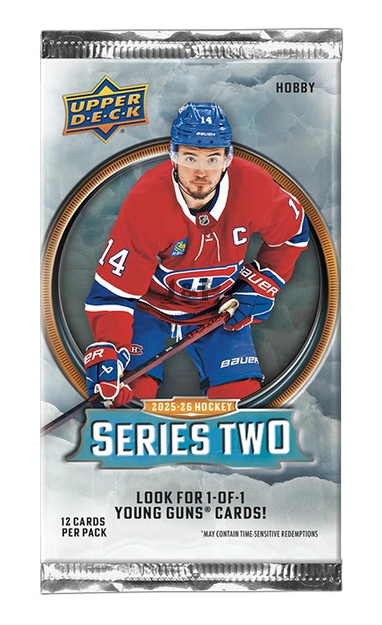 A Series 2 a 2025–26-os Upper Deck Base Set következő 250 kártyáját tartalmazza. Az Upper Deck Base Set minden évben a jégkorong legszélesebb körben gyűjtött alap szettje. Összesen 198 veterán játékos kártyát, 49 Young Guns® újonc kártyát és három checklist kártyát foglal magában. Az ikonikus Young Guns® a szezon legjobban várt újonc kártyái. Dobozonként átlagosan hat Young Guns® kártya gyűjthető!